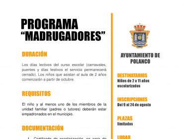 Se abre el plazo para inscribirse en el programa "Madrugadores" antigua "Guardería de invierno". Destinatarios: niños de 2 a 11 años escolarizados. Inscripciones: del 9 al 24 de agosto. Lugar: CEIP Pérez Galdós de Requejada. Precio: Según Ordenanza Fiscal nº 23, art. 4. Horario: de 7:30 a 9 horas. Los meses de septiembre y junio...
