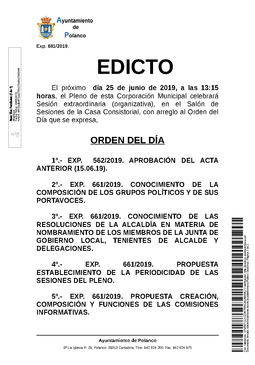 El próximo día 25 de junio de 2019, a las13:15 horas, el Pleno de esta Corporación Municipal celebrará Sesión extraordinaria (organizativa), en el Salón de Sesiones de la Casa Consistorial, con arreglo al Orden del Día que se expresa,