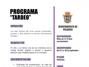 Se abre el plazo para inscribirse en el programa "Tardeo". Destinatarios: niños de 2 a 11 años escolarizados. Inscripciones: del 25 al 30 de septiembre de 2020. Precio: Según Ordenanza Fiscal nº 23, art. 4. Horario: de 16:00 a 17:30horas. La lista provisional de admitidos se publicará el 30 de septiembre de 2020. Plazas limitadas....