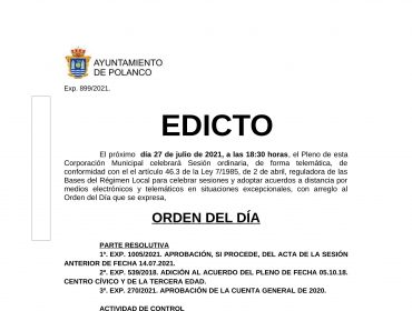 Pleno ordinario Ayuntamiento de Polanco 27 de julio de 2021 El próximo día 27 de julio de 2021, a las 18:30 horas, el Pleno de esta Corporación Municipal celebrará Sesión ordinaria, de forma telemática, de conformidad con el el artículo 46.3 de la Ley 7/1985, de 2 de abril, reguladora de las Bases del Régimen...