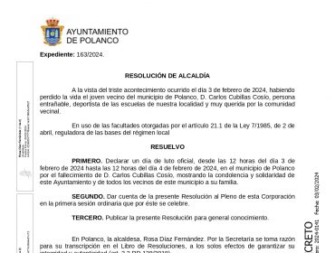 El Ayuntamiento de Polanco ha decretado un día de luto oficial por la muerte esta pasada madrugada en un luctuoso suceso del joven de Rumoroso Carlos Cubillas Cosío, de 21 años, persona entrañable, deportistas de las escuelas municipales y muy querida por todos los vecinos. El luto oficial será entre las 12.00 horas de hoy...