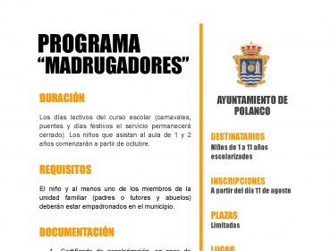 A partir del día 11 de agosto se abre el plazo para inscribirse en el programa "Madrugadores". Destinatarios: niños de 1 a 11 años escolarizados. Inscripciones: del 11 de agosto y hasta completar plazas, de manera presencial o a través de la Sede Electrónica. Precio: Según Ordenanza Fiscal nº 23, art. 4. Horario: de 7:30...