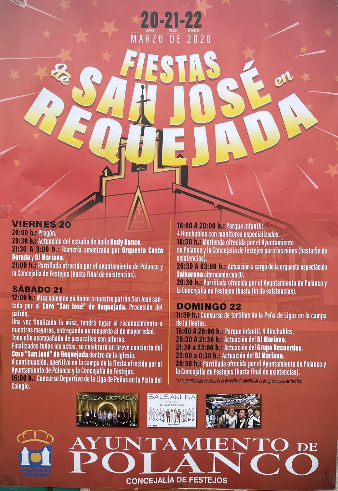 Requejada volverá a rendir homenaje a su patrón con la celebración de las fiestas de San José, que se desarrollarán del 20 al 22 de marzo con un amplio programa de actividades organizado por la Concejalía de Festejos del Ayuntamiento de Polanco y los colectivos locales, en el que se combinan los actos religiosos, las propuestas musicales, las actividades infantiles y los encuentros vecinales en torno a la campa de la fiesta.