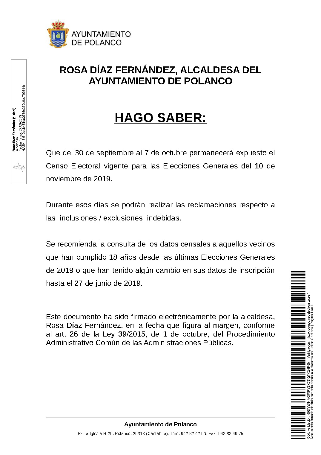 Exposición de las listas del censo electoral. Elecciones Generales 10 de noviembre de 2019