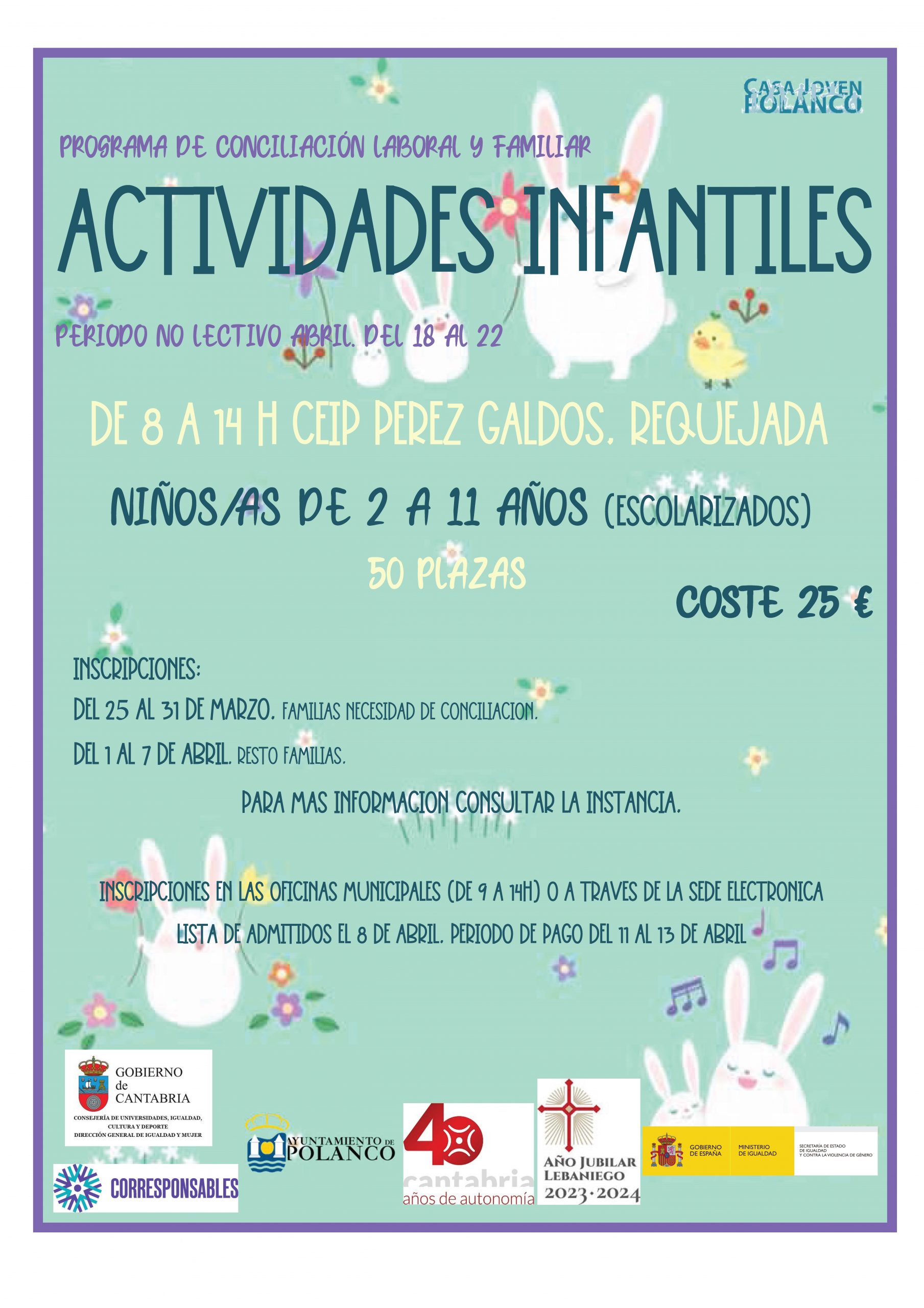 El Ayuntamiento de Polanco a través de la Concejalía de Educación, Cultura y Juventud pone en marcha el programa de conciliación familiar y laboral que se va a desarrollar durante los días 18,19,20,21 y 22 de abril en horario de 8 a 14 h en el CEIP Pérez Galdós de Requejada.