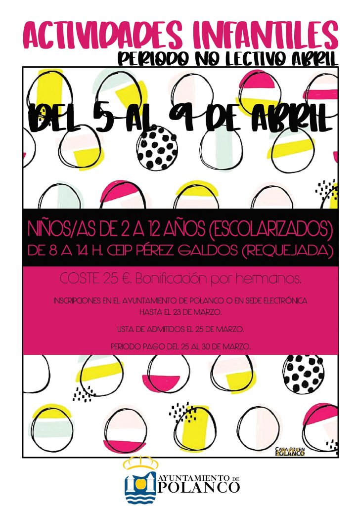 El Ayuntamiento de Polanco a través de la Concejalía de Educación, Cultura y Juventud pone en marcha el programa de conciliación familiar y laboral que se va a desarrollar del 5 al 9 de abril en horario de 8 a 14 h en el CEIP Pérez Galdós de Requejada.