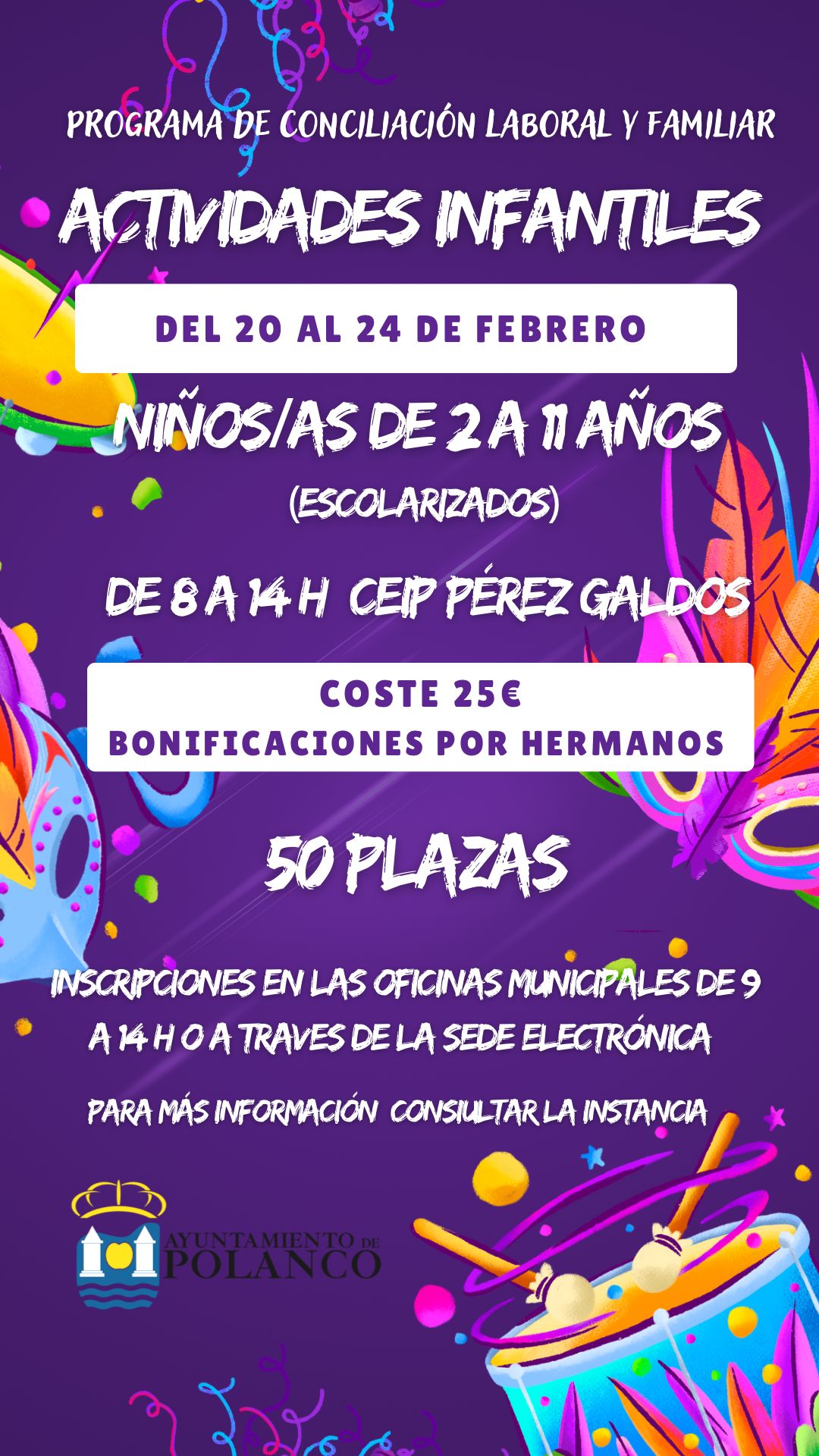 El Ayuntamiento de Polanco a través de la Concejalía de Educación, Cultura y Juventud pone en marcha el programa de conciliación familiar y laboral que se va a desarrollar durante los días 20, 21, 22, 23 y 24 de febrero en horario de 8 a 14 h en el CEIP Pérez Galdós de Requejada.