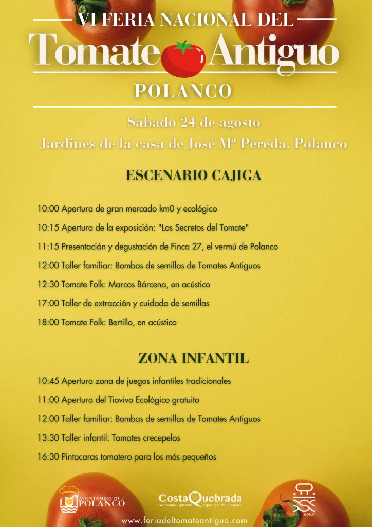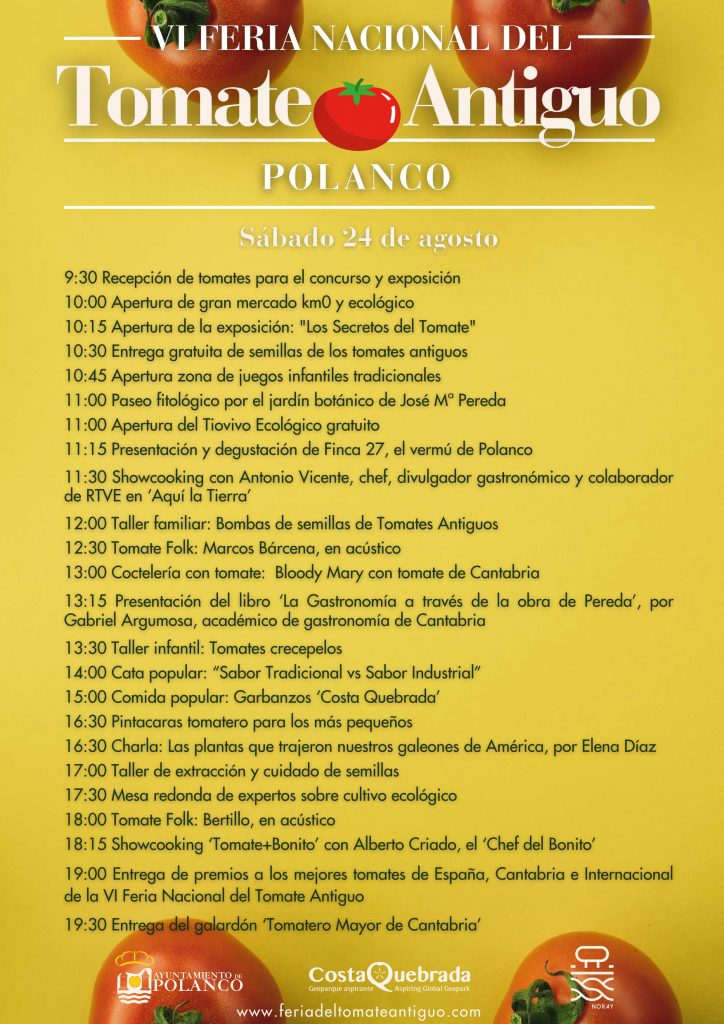 A las 14.00 horas tendrá lugar la cata popular de tomate “Sabor tradicional vs sabor industrial”, previa a una comida popular a base de Garbanzos ‘Costa Quebrada’, comida que tendrá carácter solidario ya que la venta de boletos al precio de 3 euros se destinará a la Ong Cantabria por el Sáhara. Por la tarde, seguirán las actividades, entre ellas un taller de extracción y cuidado de semillas, y una mesa redonda de expertos sobre cultivo ecológico.