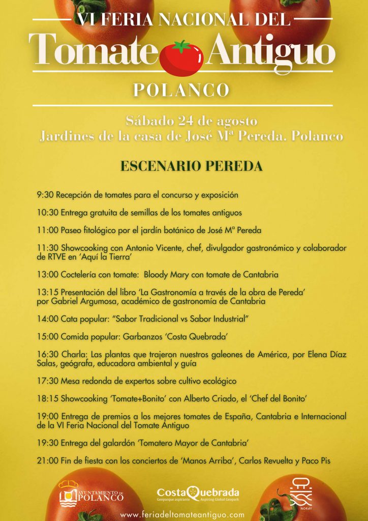 A las 11.30 horas está previsto en el escenario Pereda el primer showcooking de la jornada, a cargo del chef y divulgador gastronómico Antonio Vicente, conocido por su defensa del producto local, al que seguirá un taller familiar sobre «bombas de semillas de tomates antiguos», un actuación en acústico de Marcos Bárcena dentro del Tomate Folk, y una clase sobre coctelería con tomate donde se elaborará el famoso Bloody Mary con tomate de Cantabria.