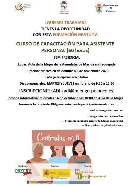Días presenciales: MARTES Y JUEVES en horario de 9:30 a 13:30 INSCRIPCIONES: ADL (adl@miengo-polanco.es) Jornada informativa: miércoles 14 de octubre a las 10:00 en Aula de la Mujer Necesaria fotocopia del DNI/pasaporte para la participación en el curso.