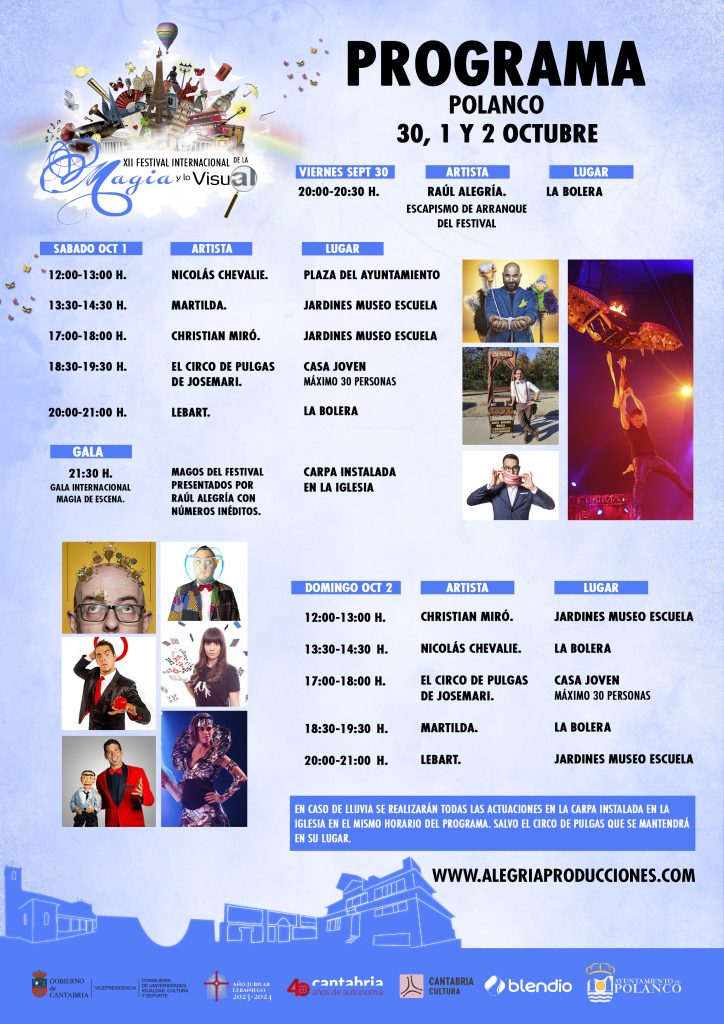 El Festival Internacional de la Magia y lo Visual regresa a Polanco este fin de semana (30 de septiembre y 1 y 2 de octubre) de la mano del mago cántabro Raúl Alegría, que reunirá a seis artistas para actuar en algunos de los lugares más emblemáticos de la localidad como la plaza del Ayuntamiento, los jardines del Museo de la Escuela, la bolera de La Cochera, la biblioteca o la Casa Joven.