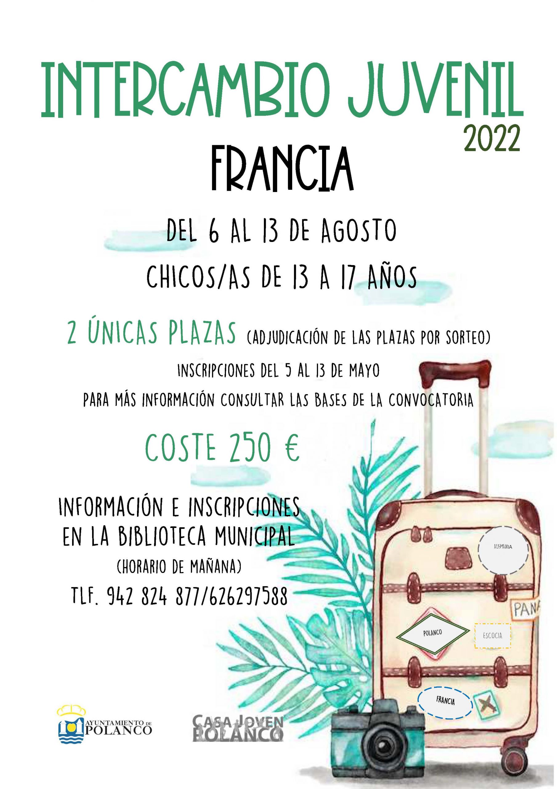 El Ayuntamiento de Polanco a través de la concejalía de Cultura, Juventud y Hermanamiento organiza un intercambio juvenil con el fin de ofrecer a los jóvenes de Polanco la posibilidad de viajar, conocer otras culturas, compartir ideas e inquietudes con jóvenes de Francia, Alemania y Escocia.