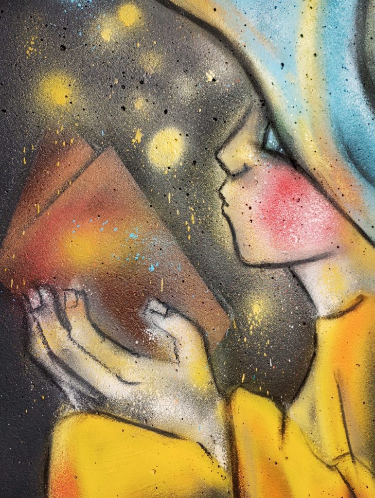 En la nueva intervención, la artista escenifica un cuento, narrando visualmente una versión acorde a los tiempos modernos, donde Blancanieves y Caperucita han sido transformados por el arte mural de Mar Pajarón en símbolos de una tradición capaz de reinterpretarse.