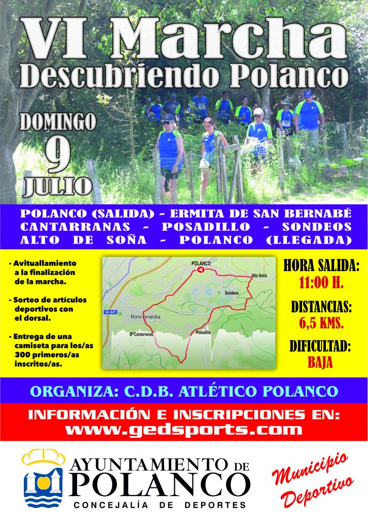 Esta marcha se denomina «Descubriendo Polanco», está organizada por la Concejalía de Deportes, junto al Club Atlético Polanco, y en esta edición los participantes recorrerán zonas el entorno de la ermita de San Bernabé (Rinconeda), el barrio de Cantarranas, Posadillo, la zona de los sondeos de Solvay y el Alto de Soña, para regresar al lugar de salida en el centro de Polanco.