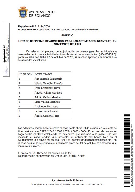Los admitidos podrán hacer efectivo el pago hasta el día 29 de octubre en la cuenta de Liberbank número ES95 / 2048 / 2087 / 6534 / 0000 / 0054. En el caso de que no se haga dentro el plazo establecido se entenderá que renuncia a la plaza. Una vez realizado el pago tendrán que presentar el justificante del banco bien en el Ayuntamiento o a través del fax (942 824 975) o email registro@aytopolanco.org), en el caso de que no se entregue el justificante antes del 29 de octubre se entenderá que renuncia a la plaza.