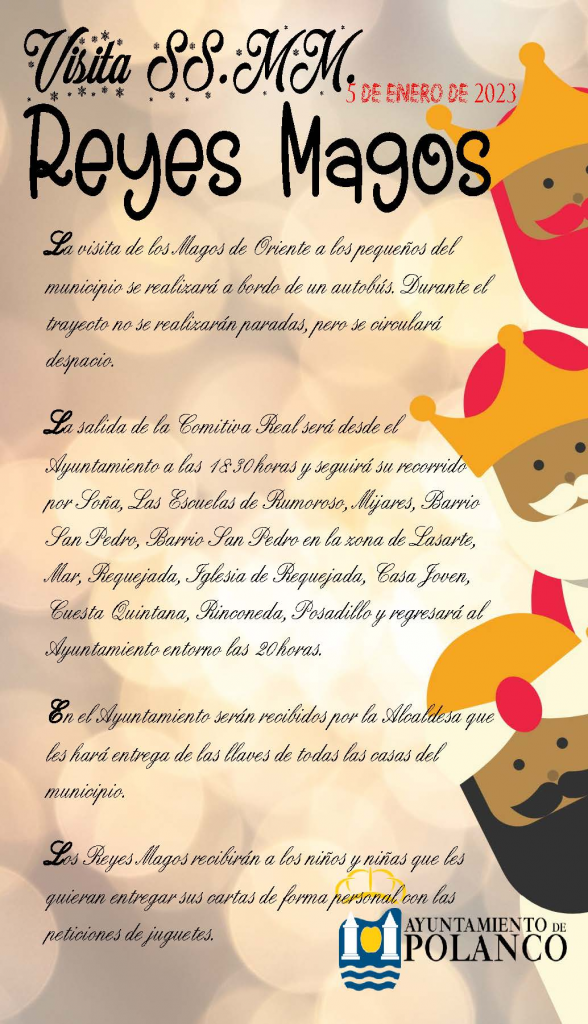 Los Reyes Magos regresarán puntuales a su cita con los niños y niñas de Polanco la tarde-noche de este próximo jueves 5 de enero, visitando cada uno de los ocho pueblos y barrios a bordo de un autobús y acompañados de su séquito, para que todos los pequeños puedan verlos en su recorrido, ya que circulará despacio sin que se prevean paradas.