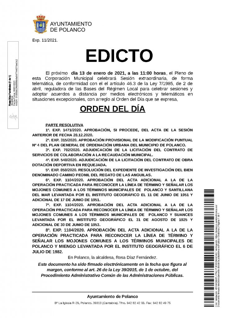 El próximo día 13 de enero de 2021, a las 11:00 horas, el Pleno de esta Corporación Municipal celebrará Sesión extraordinaria, de forma telemática, de conformidad con el el artículo 46.3 de la Ley 7/1985, de 2 de abril, reguladora de las Bases del Régimen Local para celebrar sesiones y adoptar acuerdos a distancia por medios electrónicos y telemáticos en situaciones excepcionales, con arreglo al Orden del Día que se expresa,