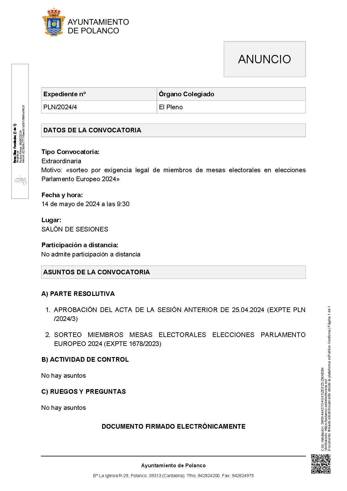 Pleno extraordinario de 14 de mayo de 2024, a las 9:30 horas