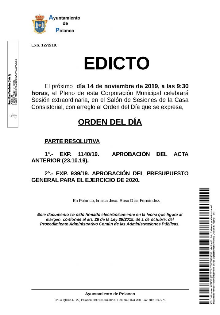 El próximo día 14 de noviembre de 2019, a las 9:30 horas, el Pleno de esta Corporación Municipal celebrará Sesión extraordinaria, en el Salón de Sesiones de la Casa Consistorial, con arreglo al Orden del Día que se expresa,