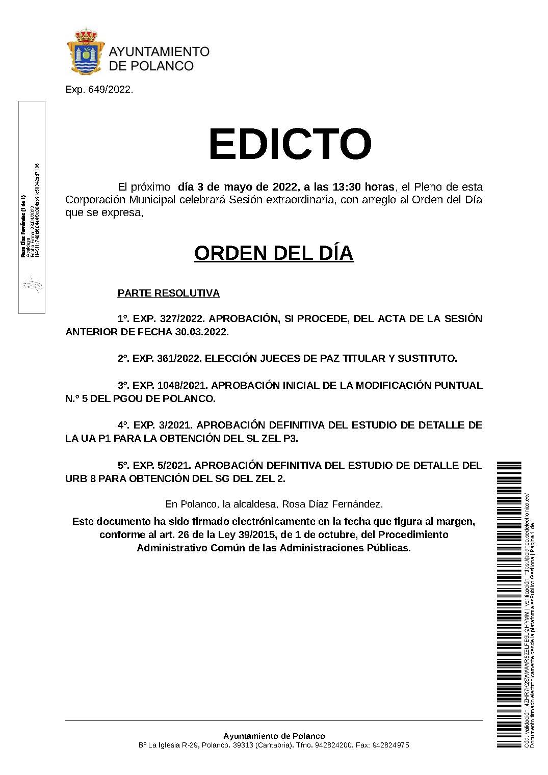 El próximo día 3 de mayo de 2022, a las 13:30 horas, el Pleno de esta Corporación Municipal celebrará Sesión extraordinaria, con arreglo al Orden del Día que se expresa: