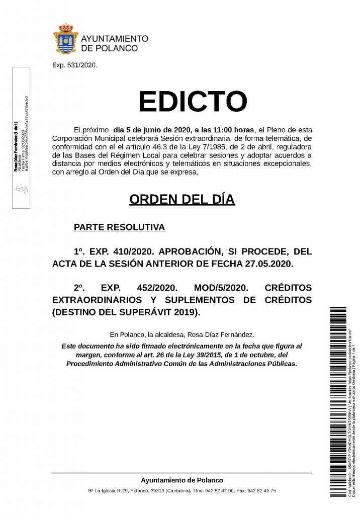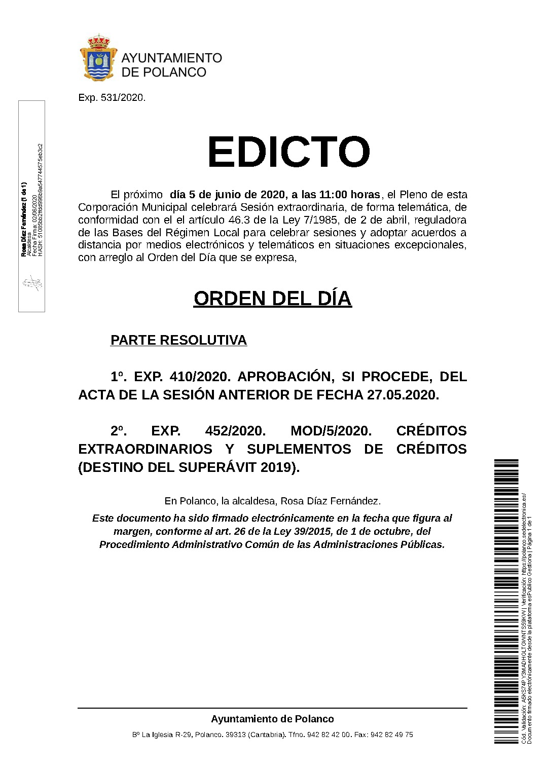 El próximo día 5 de junio de 2020, a las 11 horas, el Pleno de esta Corporación Municipal celebrará Sesión extraordinaria, de forma telemática, de conformidad con el artículo 46.3 de la Ley 7/1985, de 2 de abril, reguladora de las Bases de Régimen Local para celebrar sesiones y adoptar acuerdos a distancia por medios electrónicos y telemáticos en situaciones excepcionales, con arreglo al Orden del Día que se expresa,