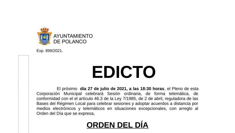 El próximo día 27 de julio de 2021, a las 18:30 horas, el Pleno de esta Corporación Municipal celebrará Sesión ordinaria, de forma telemática, de conformidad con el el artículo 46.3 de la Ley 7/1985, de 2 de abril, reguladora de las Bases del Régimen Local para celebrar sesiones y adoptar acuerdos a distancia por medios electrónicos y telemáticos en situaciones excepcionales, con arreglo al Orden del Día que se expresa,