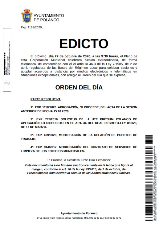 El próximo día 27 de octubre de 2020, a las 9:30 horas, el Pleno de esta Corporación Municipal celebrará Sesión extraordinaria, de forma telemática, de conformidad con el el artículo 46.3 de la Ley 7/1985, de 2 de abril, reguladora de las Bases del Régimen Local para celebrar sesiones y adoptar acuerdos a distancia por medios electrónicos y telemáticos en situaciones excepcionales, con arreglo al Orden del Día que se expresa,