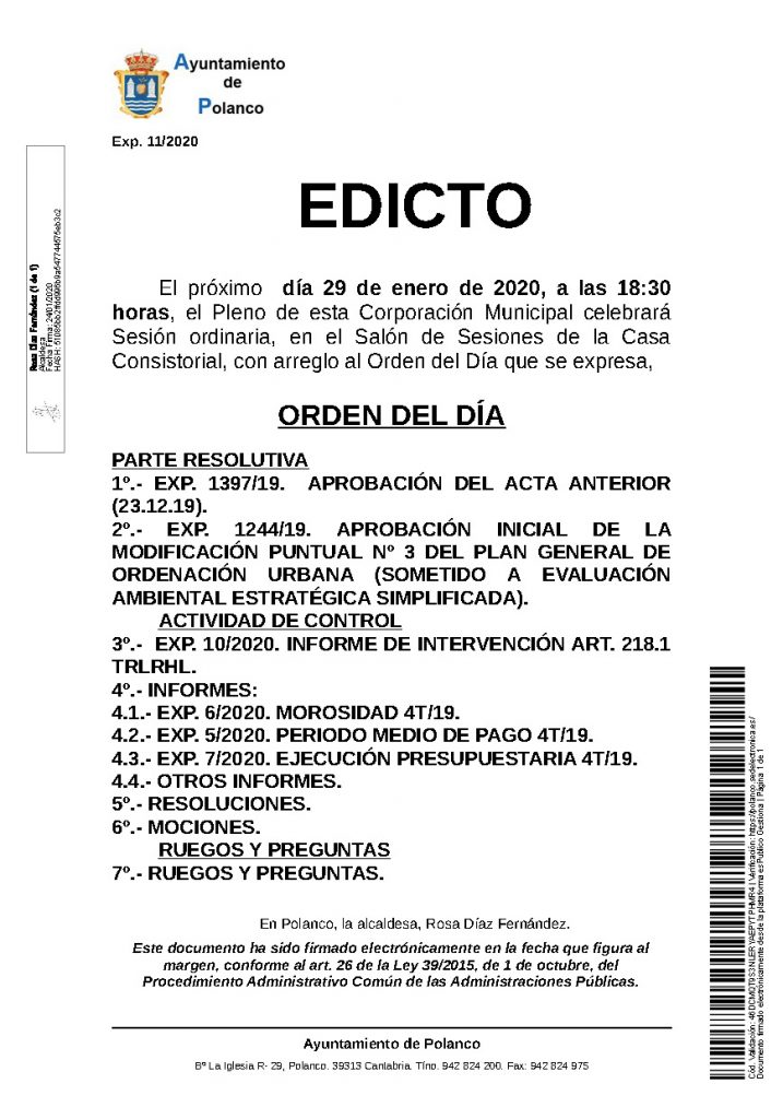 El próximo día 29 de enero de 2020, a las 18:30 horas, el Pleno de esta Corporación Municipal celebrará Sesión ordinaria, en el Salón de Sesiones de la Casa Consistorial, con arreglo al Orden del Día que se expresa,