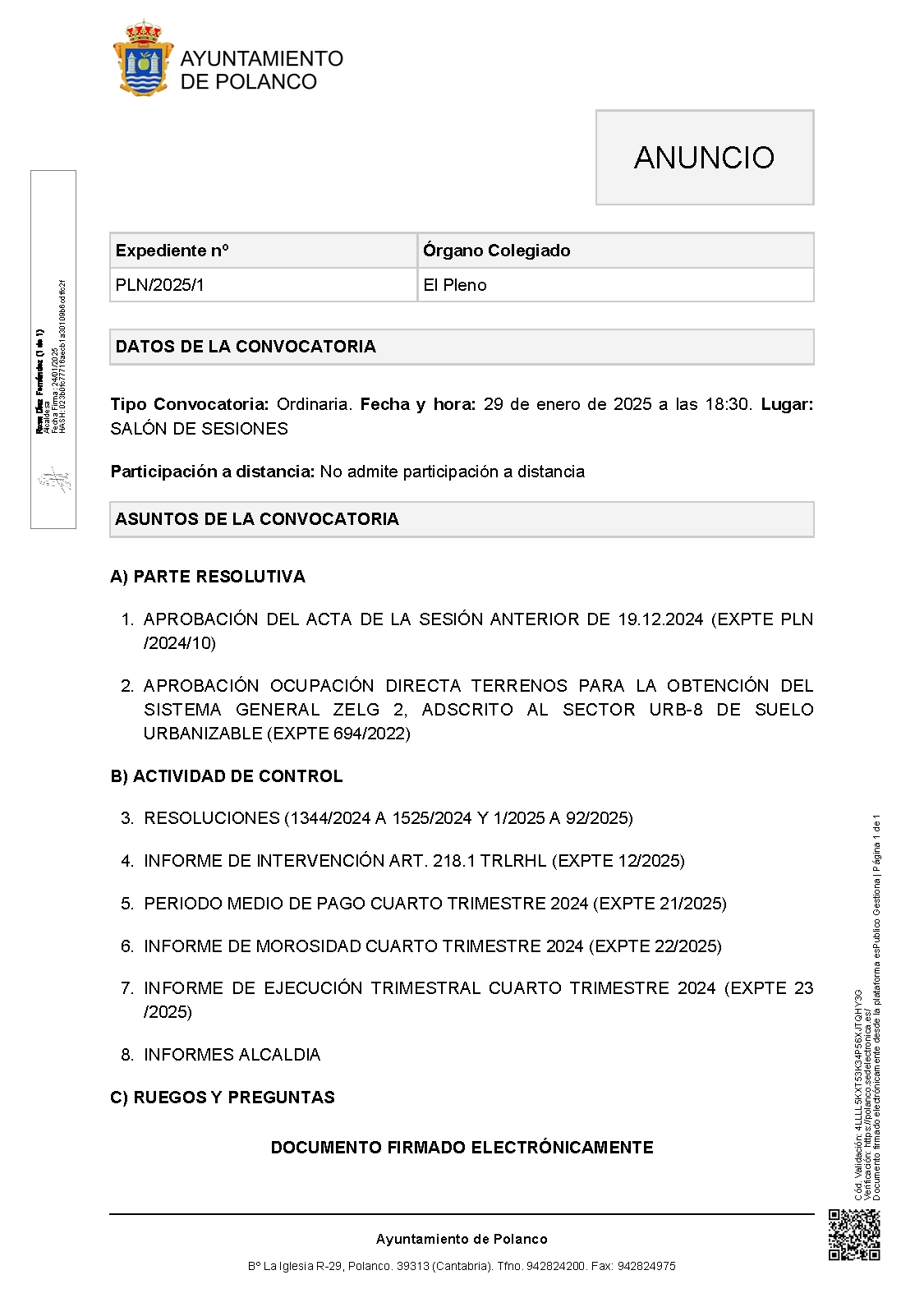 Pleno ordinario de 29 de enero de 2025 a las 18:30 horas
