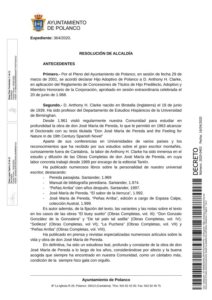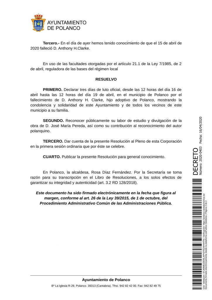 El Ayuntamiento de Polanco ha decretado tres días de luto oficial por el fallecimiento a los 81 años víctima del coronavirus del Hijo Adoptivo del municipio, el investigador y ensayista Anthony Clarke, uno de los más prestigioso especialistas sobre el escritor José María de Pereda, además de gran conocedor y divulgador de la cultura de Cantabria.