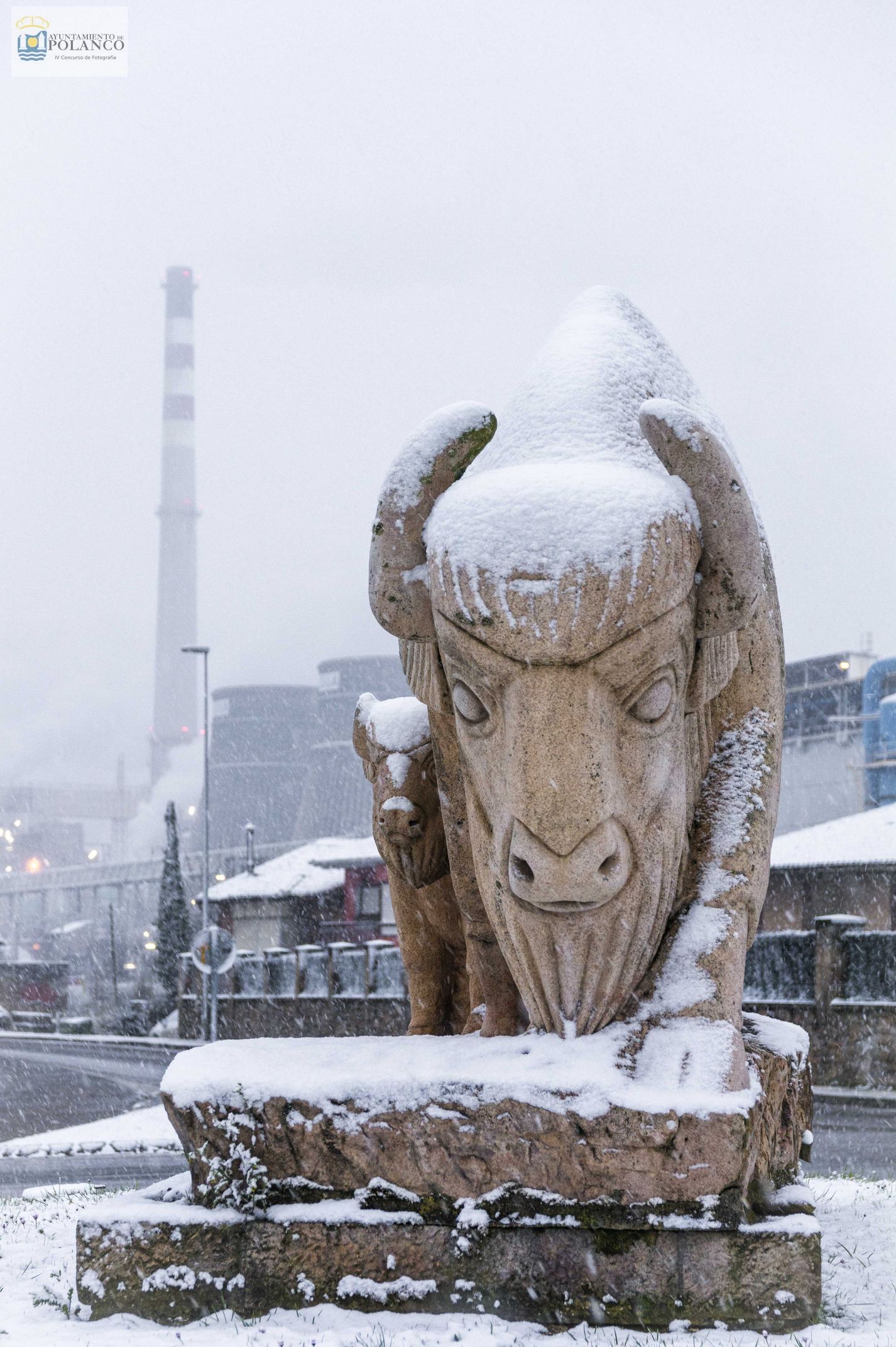 El segundo premio ha sido para una fotografía realizada por José Luis Calleja Gutiérrez, en la que se puede ver la escultura bajo una capa de nieve del bisonte situada en la rotonda de Rinconeda con las chimeneas de la factoría Solvay al fondo. Su autor se ha adjudicado un premio de 250 euros.