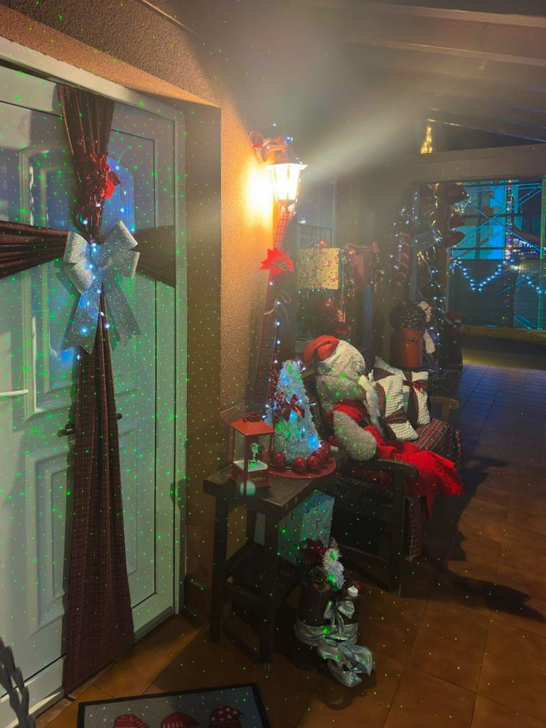 El conjunto incluye varias decenas de pequeñas bombillas, así como otro elementos como guirnaldas, grandes cajas de regalos colgando del porche, figuras de Bambi y árboles hechos con hojas secas.